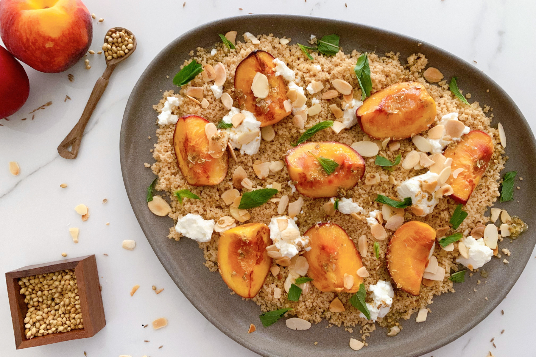 Goat’s cheese and nectarine salad with roasted, crushed coriander seeds.